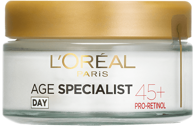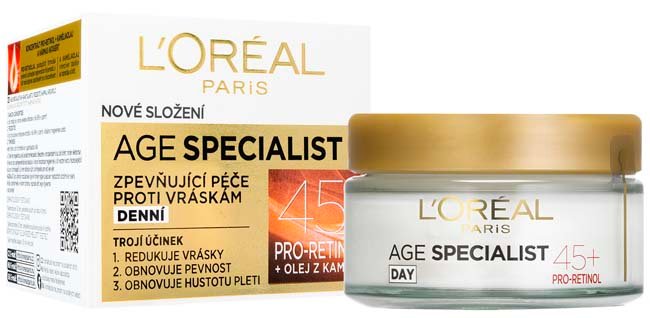 V každom veku má pleť iné potreby. Krémy Age Specialist sú šité na mieru danému veku. Po 45. roku života dochádza k spomaľovaniu bunkovej regenerácie. Postupne sa objavujú viditeľné vrásky. Pokožka stráca svoju pevnosť a kontúry sú menej zreteľné. Denný krém L’Oréal Paris Age Specialist 45+ pomáha bojovať proti prejavom starnutia pleti. Krém pokožku počas dňa intenzívne hydratuje a výsledkom je viditeľne pevnejšia a hodvábne hladká pleť. Denný krém Age Specialist 45+ je vhodný pre ženy nad 45 rokov.