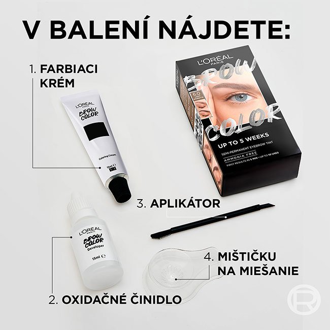 Ako docieliť dokonalé obočie? Dôkladne očistite obočie a odstráňte všetok make-up. Naneste akýkoľvek hydratačný krém na okolie obočia, aby ste vytvorili bariéru a predišli tak zafarbeniu pokožky. Zmiešajte farbiaci krém s oxidačným činidlom tak, ako je vysvetlené v návode na použitie. Naneste na obočie pomocou štetca, ktorý je súčasťou súpravy. Okraje utrite špičkou aplikátora pre definíciu cieľového tvaru. Počkajte 5-10 minút v závislosti na požadovanej intenzite odtieňa. Odstráňte zmes navlhčenými vatovými tampónmi. Prípavok skladujte na suchom mieste.