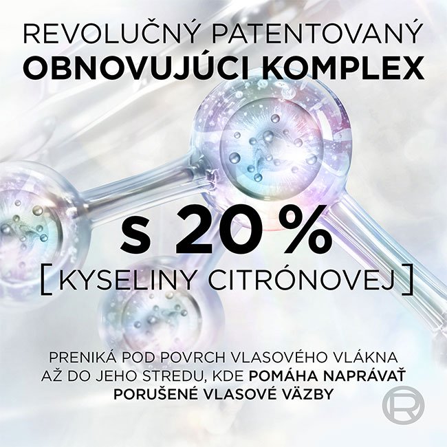 Historicky po prvý raz predstavujeme najintenzívnejšiu obnovu vlasov od L´Oréal Paris. Bezoplachová starostlivosť obohatená o kyselinu citrónovú, preniká pod povrch vlasového vlákna až do jeho stredu, kde napomáha naprávať a posilňovať oslabené vlasové väzby. Vlasy sú silnejšie, lesklejšie a ľahšie sa upravujú - 12x menej rozštiepených konečkov(1), +98% silnejšie vlasy(2), +82 % lesku(2). Pre všetky typy poškodených vlasov. (1) Inštrumentálny test po aplikácii predšampónovej starostlivosti + šampónu. (2)Inštrumentálny test.
