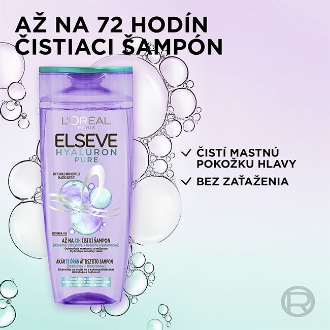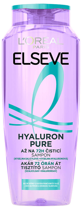 Mastné korienky a suché končeky vlasov? Náš čistiaci šampón na vlasy s kyselinou salicylovou a hyalurónovou odstraňuje mastnotu a nečistoty z pokožky hlavy a vlasom poskytuje rehydratáciu až na 72 hodín s dosiahnutím čistých korienkov a hydratovaných dĺžok bez zaťaženia. (1) (1) Spotrebiteľský test, 59 používateľov, 72 hodín po použití séra + šampónu + balzamu z radu Hyaluron Pure.