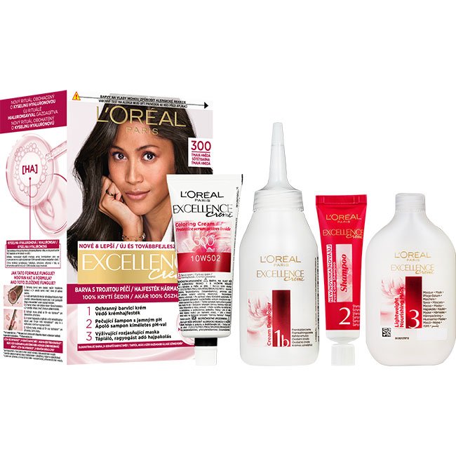 Permanentná farba obohatená o ochranné zložky. L'Oréal Paris Excellence prináša rituál farbenia s trojitou ochranou obohatený o kyselinu hyalurónovú, pričom sa stará o vašu farbu, pokožku hlavy aj o vaše vlasy. S novým jemným ošetrujúcim pH šampónom po farbení budú vaše vlasy hladké a plné lesku s prirodzene vyzerajúcou farbou. Kryje 100 % šedín. Kyselina hyalurónová je účinná molekula zachytávajúca hydratáciu, prirodzene prítomná v tele, so schopnosťou zadržať vodu až v 1000-násobku svojej hmotnosti. Ako pôsobí vo farbách na vlasy? 1. V ochrannom farbiacom kréme dodáva vlasom hĺbkovú hydratáciu a 2× bohatší farebný výsledok*. 2. Vo vyživujúcej maske prináša až 10x viac hydratácie** pre dlhodobo žiarivú farbu. * V porovnaní s pôvodnou zmesou (farbiaci krém + oxidačné činidlo), inštrumentálny test viskozity. ** Inštrumentálny test.