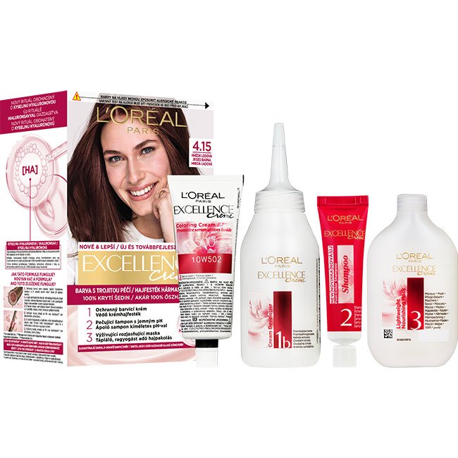 Permanentná farba obohatená o ochranné zložky. L'Oréal Paris Excellence prináša rituál farbenia s trojitou ochranou obohatený o kyselinu hyalurónovú, pričom sa stará o vašu farbu, pokožku hlavy aj o vaše vlasy. S novým jemným ošetrujúcim pH šampónom po farbení budú vaše vlasy hladké a plné lesku s prirodzene vyzerajúcou farbou. Kryje 100 % šedín. Kyselina hyalurónová je účinná molekula zachytávajúca hydratáciu, prirodzene prítomná v tele, so schopnosťou zadržať vodu až v 1000-násobku svojej hmotnosti. Ako pôsobí vo farbách na vlasy? 1. V ochrannom farbiacom kréme dodáva vlasom hĺbkovú hydratáciu a 2× bohatší farebný výsledok*. 2. Vo vyživujúcej maske prináša až 10x viac hydratácie** pre dlhodobo žiarivú farbu. * V porovnaní s pôvodnou zmesou (farbiaci krém + oxidačné činidlo), inštrumentálny test viskozity. ** Inštrumentálny test.