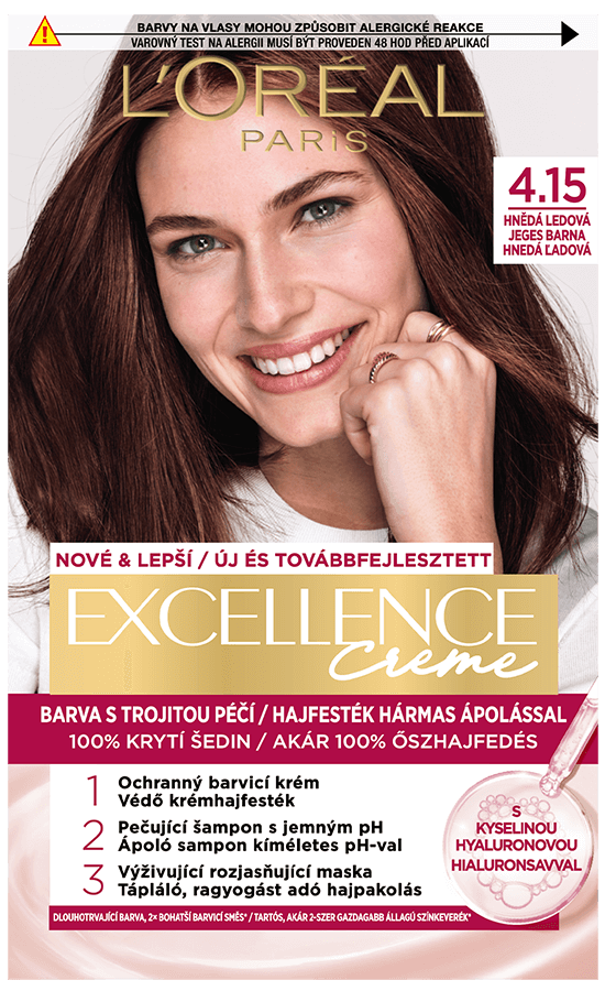 Permanentná farba obohatená o ochranné zložky. L'Oréal Paris Excellence prináša rituál farbenia s trojitou ochranou obohatený o kyselinu hyalurónovú, pričom sa stará o vašu farbu, pokožku hlavy aj o vaše vlasy. S novým jemným ošetrujúcim pH šampónom po farbení budú vaše vlasy hladké a plné lesku s prirodzene vyzerajúcou farbou. Kryje 100 % šedín. Kyselina hyalurónová je účinná molekula zachytávajúca hydratáciu, prirodzene prítomná v tele, so schopnosťou zadržať vodu až v 1000-násobku svojej hmotnosti. Ako pôsobí vo farbách na vlasy? 1. V ochrannom farbiacom kréme dodáva vlasom hĺbkovú hydratáciu a 2× bohatší farebný výsledok*. 2. Vo vyživujúcej maske prináša až 10x viac hydratácie** pre dlhodobo žiarivú farbu. * V porovnaní s pôvodnou zmesou (farbiaci krém + oxidačné činidlo), inštrumentálny test viskozity. ** Inštrumentálny test.