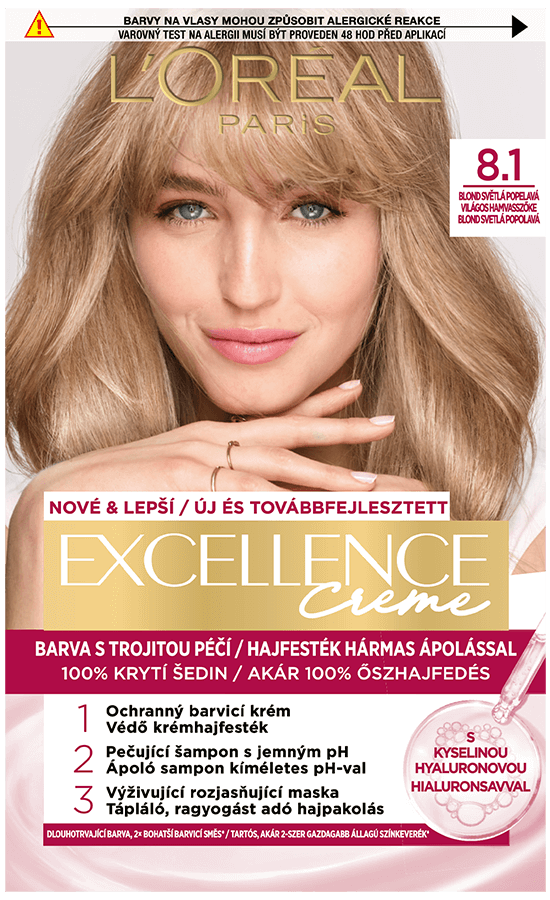 Permanentná farba obohatená o ochranné zložky. L'Oréal Paris Excellence prináša rituál farbenia s trojitou ochranou obohatený o kyselinu hyalurónovú, pričom sa stará o vašu farbu, pokožku hlavy aj o vaše vlasy. S novým jemným ošetrujúcim pH šampónom po farbení budú vaše vlasy hladké a plné lesku s prirodzene vyzerajúcou farbou. Kryje 100 % šedín. Kyselina hyalurónová je účinná molekula zachytávajúca hydratáciu, prirodzene prítomná v tele, so schopnosťou zadržať vodu až v 1000-násobku svojej hmotnosti. Ako pôsobí vo farbách na vlasy? 1. V ochrannom farbiacom kréme dodáva vlasom hĺbkovú hydratáciu a 2× bohatší farebný výsledok*. 2. Vo vyživujúcej maske prináša až 10x viac hydratácie** pre dlhodobo žiarivú farbu. * V porovnaní s pôvodnou zmesou (farbiaci krém + oxidačné činidlo), inštrumentálny test viskozity. ** Inštrumentálny test.