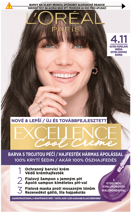 Permanentná farba obohatená o ochranné zložky. L'Oréal Paris Excellence prináša rituál farbenia s trojitou ochranou obohatený o kyselinu hyalurónovú, pričom sa stará o vašu farbu, pokožku hlavy aj o vaše vlasy. S novým jemným ošetrujúcim pH šampónom po farbení budú vaše vlasy hladké a plné lesku s prirodzene vyzerajúcou farbou. Kryje 100 % šedín. Kyselina hyalurónová je účinná molekula zachytávajúca hydratáciu, prirodzene prítomná v tele, so schopnosťou zadržať vodu až v 1000-násobku svojej hmotnosti. Ako pôsobí vo farbách na vlasy? 1. V ochrannom farbiacom kréme dodáva vlasom hĺbkovú hydratáciu a 2× bohatší farebný výsledok*. 2. Vo vyživujúcej maske prináša až 5x viac hydratácie** pre dlhodobo žiarivú farbu. Ecellence Cool Creme obsahuje tiež šampón s jemným pH a masku proti mosadzným tónom obohatenú o Purple technológiu pre studený farebný výsledok. * V porovnaní s pôvodnou zmesou (farbiaci krém + oxidačné činidlo), inštrumentálny test viskozity. ** Inštrumentálny test.