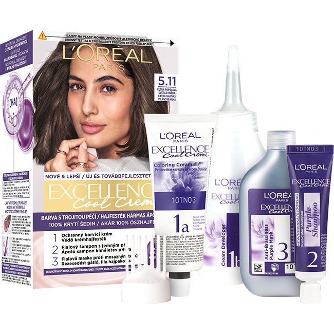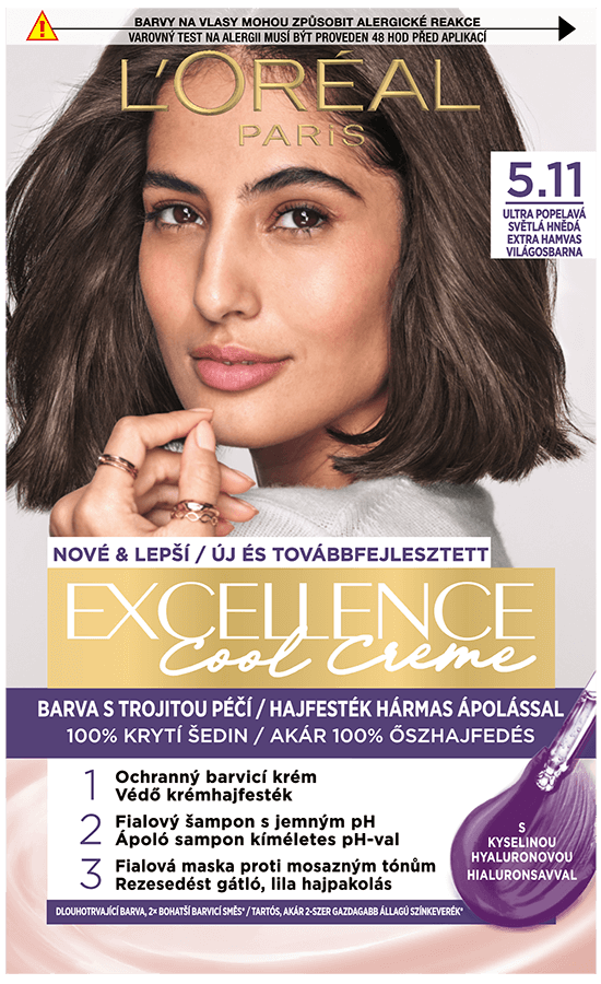 Permanentná farba obohatená o ochranné zložky. L'Oréal Paris Excellence prináša rituál farbenia s trojitou ochranou obohatený o kyselinu hyalurónovú, pričom sa stará o vašu farbu, pokožku hlavy aj o vaše vlasy. S novým jemným ošetrujúcim pH šampónom po farbení budú vaše vlasy hladké a plné lesku s prirodzene vyzerajúcou farbou. Kryje 100 % šedín. Kyselina hyalurónová je účinná molekula zachytávajúca hydratáciu, prirodzene prítomná v tele, so schopnosťou zadržať vodu až v 1000-násobku svojej hmotnosti. Ako pôsobí vo farbách na vlasy? 1. V ochrannom farbiacom kréme dodáva vlasom hĺbkovú hydratáciu a 2× bohatší farebný výsledok*. 2. Vo vyživujúcej maske prináša až 5x viac hydratácie** pre dlhodobo žiarivú farbu. Ecellence Cool Creme obsahuje tiež šampón s jemným pH a masku proti mosadzným tónom obohatenú o Purple technológiu pre studený farebný výsledok. * V porovnaní s pôvodnou zmesou (farbiaci krém + oxidačné činidlo), inštrumentálny test viskozity. ** Inštrumentálny test.