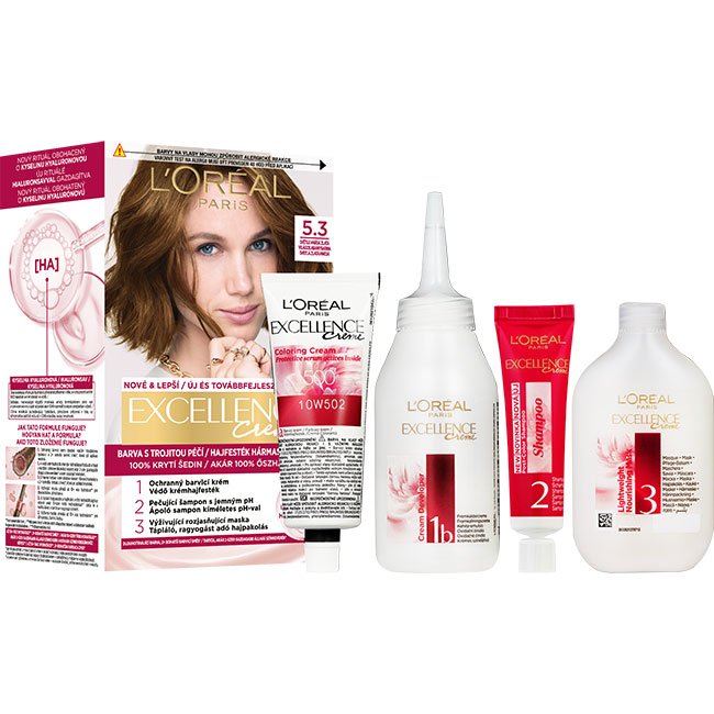 Permanentná farba obohatená o ochranné zložky. L'Oréal Paris Excellence prináša rituál farbenia s trojitou ochranou obohatený o kyselinu hyalurónovú, pričom sa stará o vašu farbu, pokožku hlavy aj o vaše vlasy. S novým jemným ošetrujúcim pH šampónom po farbení budú vaše vlasy hladké a plné lesku s prirodzene vyzerajúcou farbou. Kryje 100 % šedín. Kyselina hyalurónová je účinná molekula zachytávajúca hydratáciu, prirodzene prítomná v tele, so schopnosťou zadržať vodu až v 1000-násobku svojej hmotnosti. Ako pôsobí vo farbách na vlasy? 1. V ochrannom farbiacom kréme dodáva vlasom hĺbkovú hydratáciu a 2× bohatší farebný výsledok*. 2. Vo vyživujúcej maske prináša až 10x viac hydratácie** pre dlhodobo žiarivú farbu. * V porovnaní s pôvodnou zmesou (farbiaci krém + oxidačné činidlo), inštrumentálny test viskozity. ** Inštrumentálny test.