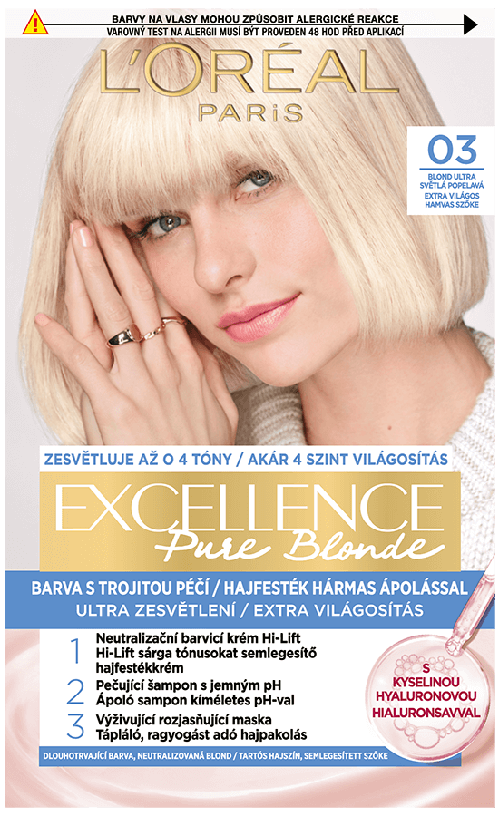 Permanentná farba s neutralizačnou technológiou Hi-Lift obohatená o ochranné zložky. L'Oréal Paris Excellence Pure Blond prináša rituál farbenia s trojitou ochranou obohatený o kyselinu hyalurónovú, pričom sa stará o vašu farbu, pokožku hlavy aj o vaše vlasy. S novým jemným ošetrujúcim pH šampónom po farbení budú vaše vlasy hladké a plné lesku s prirodzene vyzerajúcou farbou. Kyselina hyalurónová je účinná molekula zachytávajúca hydratáciu, prirodzene prítomná v tele, so schopnosťou zadržať vodu až v 1000-násobku svojej hmotnosti. Ako pôsobí vo farbách na vlasy? Vo vyživujúcej maske prináša až 10x viac hydratácie* pre dlhodobo žiarivú farbu. Pure Blond navyše zosvetľuje farbu až o 4 tóny. * Inštrumentálny test.