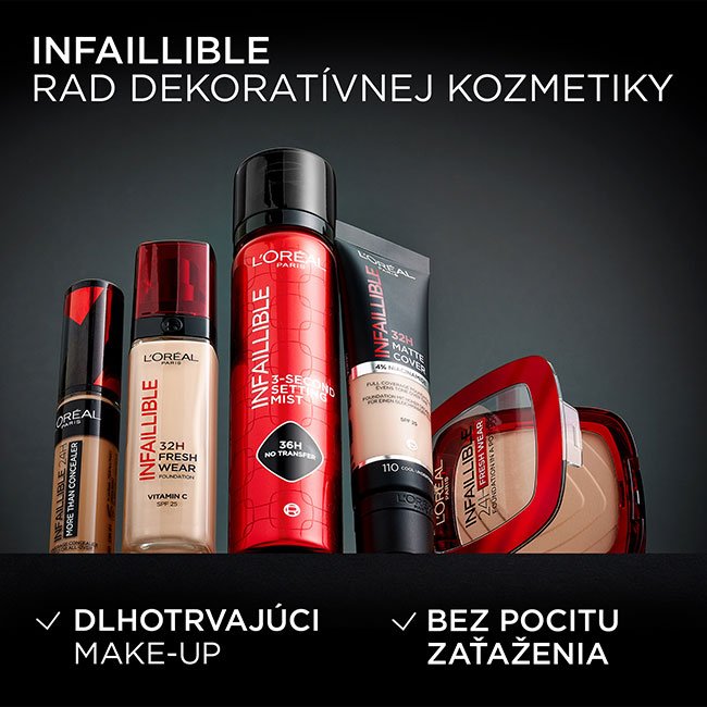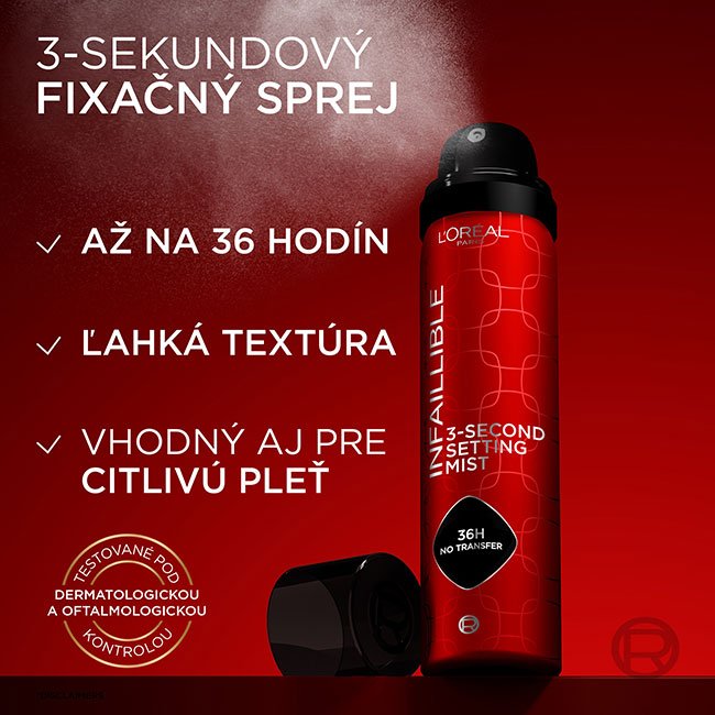 Predstavujeme nový 3-sekundový fixačný sprej Infaillible od L'Oréal Paris s inovatívnym zložením, ktoré zaschne už za 3 sekundy a zafixuje váš make-up až na 36 hodín. Jeho mikrojemná hmla vytvára povrch odolný proti oteru. Aplikácia už po 3 sekundách zaručuje výdrž make-upu na celý deň i dlhšie, nelepí a nezanecháva za sebou žiadne stopy. Nastriekajte a presvedčte sa!