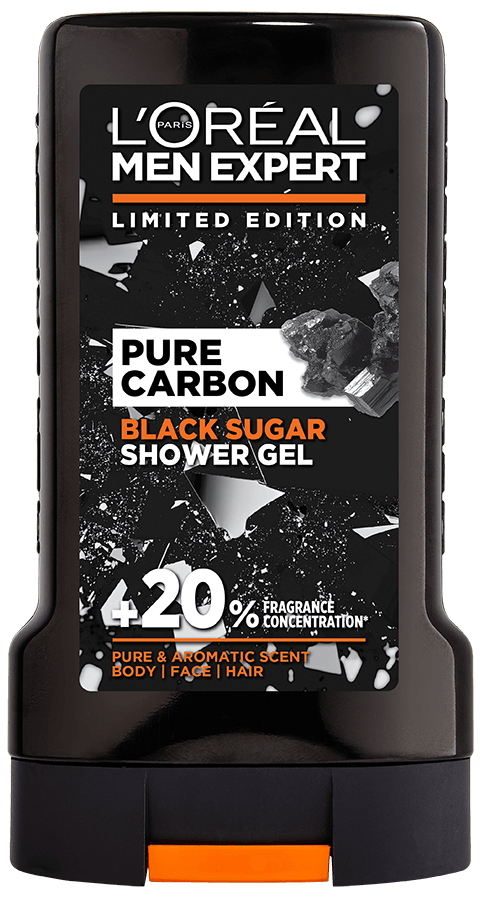 L'Oréal Paris Men Expert Pure Carbon sprchovací gél s čiernym cukrom. Až o 20 % vyššia koncentrácia vône*, ktorá vydrží až 6 hodín. Čistá a príjemná vôňa.