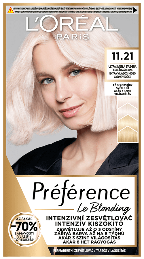 Zosvetľovač Préférence zosvetlí vaše vlasy až o 3 tóny vďaka unikátnej zosvetľujúcej sile Préférence Intensive. Priesvitný gél obohatený o UV filter, vitamín E a pigmenty odrážajúce svetlo dodá vlasom žiarivú blond plnú odleskov až na 8 týždňov. V balení sa nachádza tiež posilňujúca starostlivosť po zosvetlení na intenzívnu výživu a zníženie lámavosti vlasov až o 70 %.* * Inštrumentálny test.