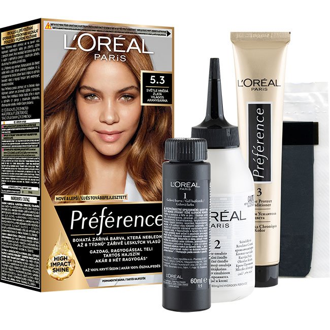 L'Oréal Paris Préférence je obohatená o technológiu Fade-Defying SYSTEMTM. Vysoká koncentrácia dlhotrvajúcich farbiacich zložiek v kombinácii s novou olejovo-gélovou textúrou pre žiarivú farbu s vysokým leskom bez vyblednutia až na 8 týždňov*. Kryje až 100 % šedín. V balení sa nachádza záverečná starostlivosť na ochranu lesku obohatená o UV filter s vitamínom E. * Inštrumentálny test.