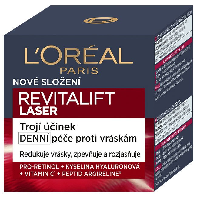 Denný krém Revitalift Laser proti vráskam je posilnený top 3 aktívnymi látkami odporúčanými dermatológmi: Pro-retinol pomáha redukovať vrásky a obnoviť textúru pleti, kyselina hyalurónová iIntenzívne hydratuje a vypĺňa pleť a vitamín C (vitamín Cg) pomáha rozžiariť pleť a viditeľne zlepšuje jej tón. Teraz obohatené o peptidy argireline®: peptid s vyhladzujúcimi účinkami, ktorý pomáha uvoľniť svalové napätie pokožky v okolí kontúr a vyhladiť vrásky. Ľahký vyživujúci krém sa rýchlo vstrebáva a pokožku zanecháva pevnú s pocitom jemnosti. Nezanecháva mastný film, nelepí sa.