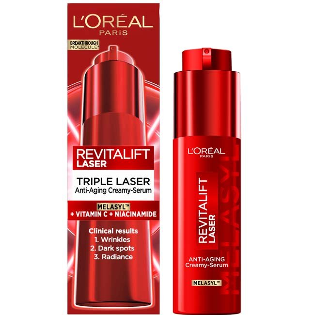 Omladzujúce krémové sérum Revitalift Laser od L'Oréal Paris s obsahom patentovanej látky Melasyl™ účinne zjemňuje hlboké vrásky, redukuje tmavé škvrny a rozjasňuje pleť. Zloženie s trojitým účinkom obsahuje revolučný Melasyl™, našu unikátnu a najúčinnejšiu látku na odstránenie hyperpigmentácie a tmavých škvŕn. Zachytáva prebytočný melanín v pokožke ešte predtým, než sa objaví na povrchu. Má preukázaný a rýchly účinok. Vitamín C*, aktívna látka s antioxidačnými účinkami, ktoré pomáhajú rozjasniť pleť a vyhladiť jemné vrásky. Niacínamid, účinná rozjasňujúca látka, ktorá pomáha odstraňovať viditeľnosť tmavých škvŕn, jemných vrások a šetrne zjemní povrch pokožky.