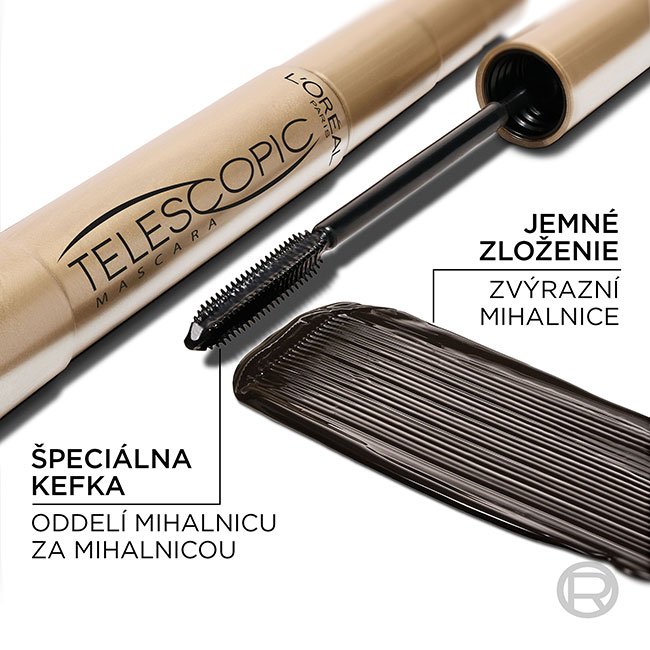 Maskara Telescopic vaše mihalnice precízne oddelí a dodá im predlžujúci efekt až o 60 %. Pomocou patentovanej flexibilnej kefky Precision Brush zachytíte všetky riasy a zvýrazíte ich tak od korienkov až po končeky. Maskara navyše nevytvára nepekné hrudky, a preto zanechá vaše mihalnice krásne čisté a elegantne čierne na pohľad.